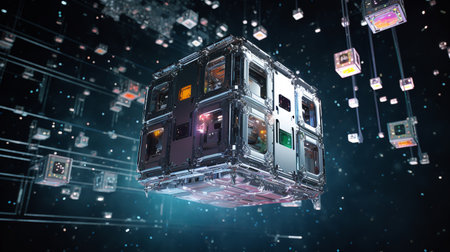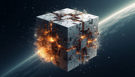 Floating cubic structures creating a futuristic space station, with a cosmic backdrop.