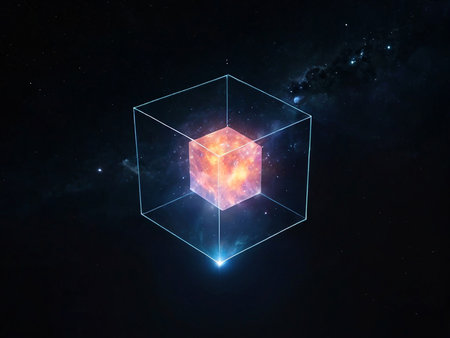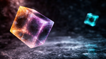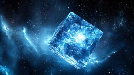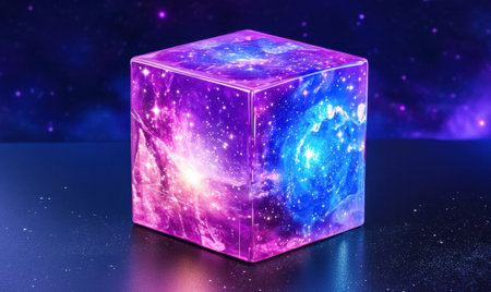 A glowing cube with a galactic scene inside, floating in a cosmic space.
