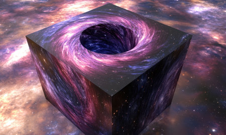 Cubic black hole in space; cosmic swirl background; science fiction concept; ideal for fantasy or sci-fi art