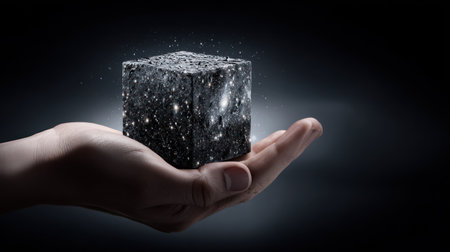 Close up of hand holding stone cube with dark background. Mixed media