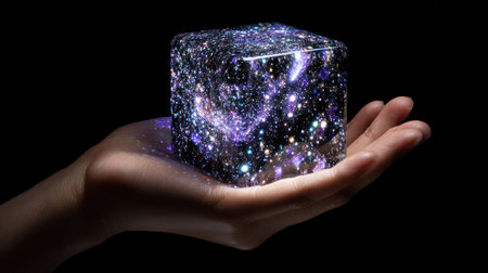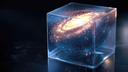 A transparent cube holds a bright, starry galaxy within its confines.