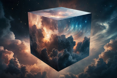 Floating in the vastness of space, a luminous cube captivates with radiant colors and swirling cosmic dust, reflecting the beauty of the universe's mysteries and infinite possibilities.
