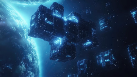 Sci-fi scene of a space station made of interconnected cubes, glowing in space. -