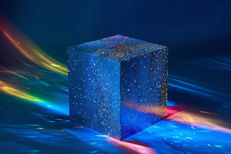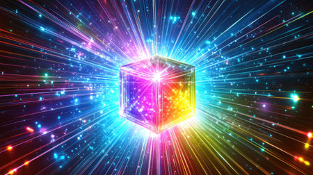 A dazzling crystal cube emits vibrant colors and light rays, creating an enchanting burst. This abstract design captures energy and creativity in a cosmic space.