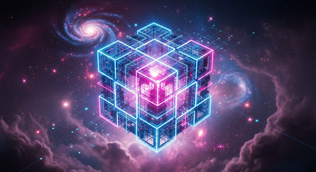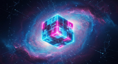 A striking, multi-layered neon cube, glowing with intense blue and pink light, is the focal point. It is positioned within a vibrant cosmic scene featuring a swirling spiral galaxy and colorful nebulae. The cube's structure is a complex lattice of interconnected lines and nodes, suggesting a digital or data construct. The surrounding space is filled with stars and cosmic dust, creating a visually rich and awe-inspiring representation of technology within the universe.