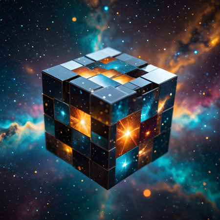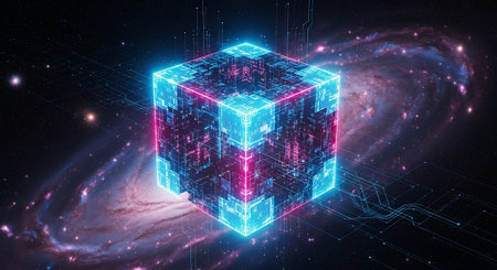 A glowing 3D cube made of smaller cubes, each with a galaxy-like appearance