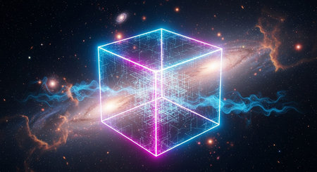 A vibrant, neon-outlined geometric cube, illuminated with blue and pink hues, floats within a swirling galaxy. Wisps of blue energy emanate from the cube, interacting with the cosmic background of stars and nebulae. The evokes a sense of advanced technology, data flow, and cosmic phenomena, presented in a visually striking and abstract manner.