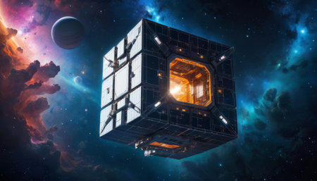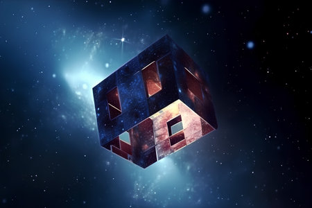 Abstract sci-fi scene with a cubic space station floating in space.