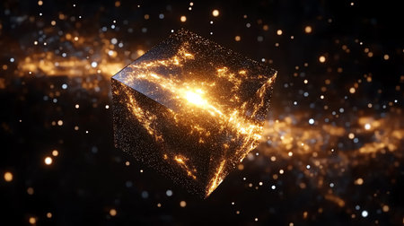 Abstract 3d rendering of golden cube. Futuristic background with glowing particles.