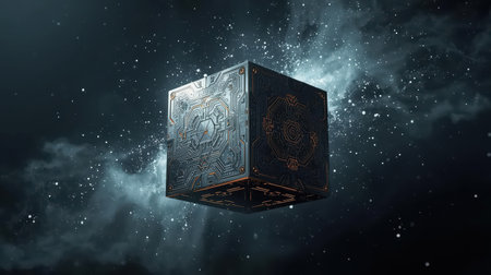 A mysterious, high-tech cube of unknown origin floats silently in the vastness of a colorful cosmic nebula. Its intricate circuits and glowing core suggest immense power and advanced intelligence, a relic of a lost civilization or a key to future technology.