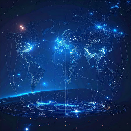 Glowing web of interconnected nodes spans continents, symbolizing global connectivity, digital networks, trade routes, information flow, cyber infrastructure, financial ties, innovation