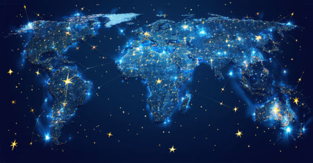 Digital world map composed of glowing blue and gold dots, interconnected by bright lines, resembling constellations, deep contrast, futuristic global network, illuminated connections