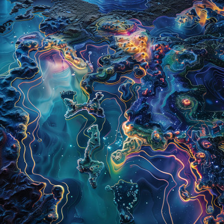 This vibrant abstract artwork features an intricate network of colorful nodes and lines, set against a dark background, embodying the essence of modern digital design.