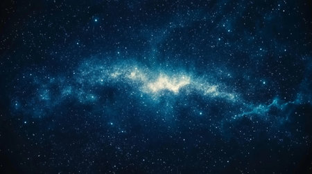 A breathtaking view of a starry night sky filled with twinkling stars and shimmering cosmic dust against a rich dark blue background, evoking calmness.