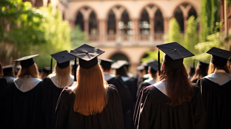 Graduates from behind looking to the future, educational achievement. Graduation time in educational institutions. With Generative AI technology.