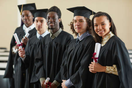 Multi-ethnic group of happy young people wearing graduation robes standing in row and looking at camera