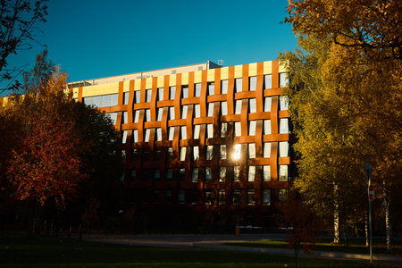 Modern apartment buildings on a sunny day with yellow leaves. Facade of a modern apartment building