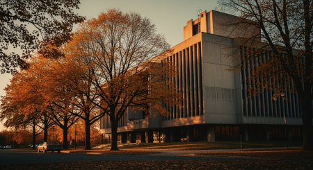A Stunning Modern Building Nestled Within Vibrant Autumn Foliage Under a Clear Blue Sky