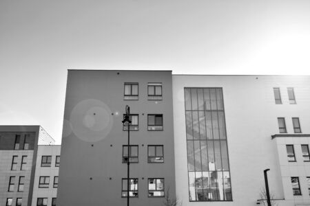 Detail of modern residential flat apartment building exterior. Fragment of new luxury house and home complex. Black and white.