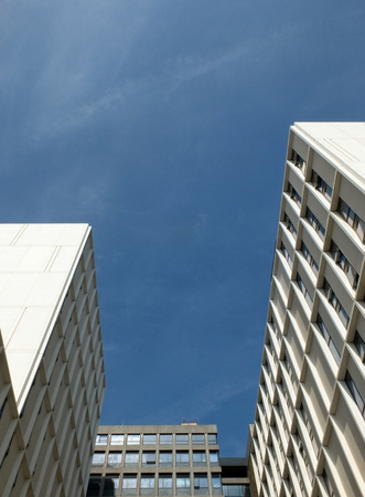 vertical looking upwards view of urban modern high white modern commercial buildings with blue sky in bright sunlight