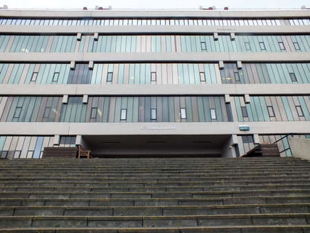 leeds, west yorkshire, united kingdom - 25 April 2019: steps and facade of the brutalist style ec stoner building at the university of leeds