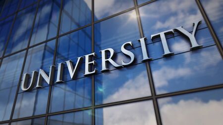 University glass building. Mirrored sky and city on modern facade. Education, knowledge, shool concept 3D rendering illustration.