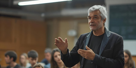A knowledgeable instructor engages students by explaining intricate ideas in a classroom. The atmosphere is focused, with equations illustrated on chalkboards behind him.