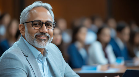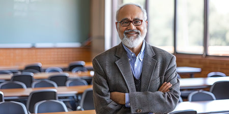 A mature man with glasses stands confidently in a lecture hall, arms crossed, looking at the camera.