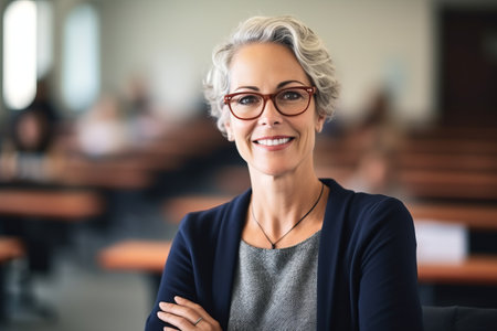 Portrait of a confident mature female teacher in a classroom setting, highlighting experience and leadership. education and inspiration