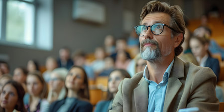A focused mature student wearing glasses attentively listens to a university lecture in a crowded classroom, reflecting lifelong learning and dedication.