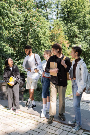 Smiling interracial students looking at cheerful asian friend with notebooks in park