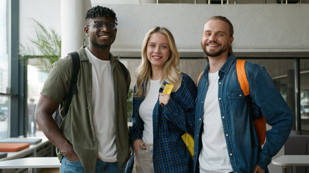 young interracial students smiling at camera in university, banner