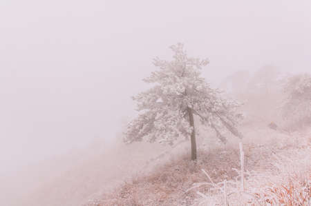 Pine tree against background covered in fog on Wugong Mountain in Jiangxi, China