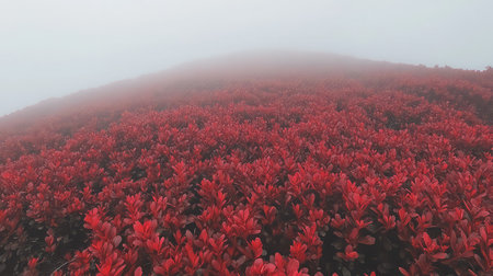 A breathtaking view of vibrant red foliage enveloped in mist creates a serene and tranquil atmosphere. The foggy backdrop enhances the beauty of nature, inviting contemplation.