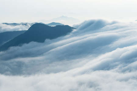 Beautiful nature sky scape cloud and fog in sunrise on peak mountains in winter at Phu Chi Fa Forest Park, Chiang Rai, Thailand