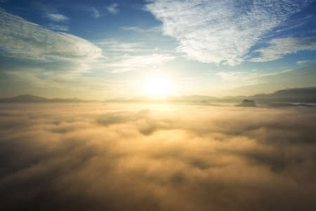 sea of ​​mist in the morning with sunrise. sea of fog over the mountain. Beautiful dramatic view.