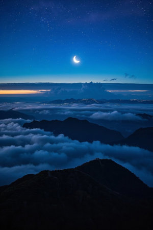 Sea of clouds and mountain landscape under the night sky