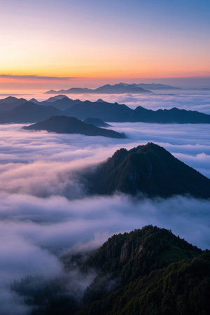 Experience the calm beauty of layered mountains enveloped in mist during sunrise. This enchanting landscape captures nature's tranquility and captivating scenery.