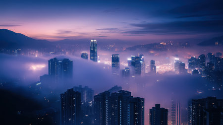 A breathtaking skyline emerges from the fog at dusk, showcasing tall buildings and shimmering lights. Mist envelops the city, creating an ethereal atmosphere with mountains in the distance