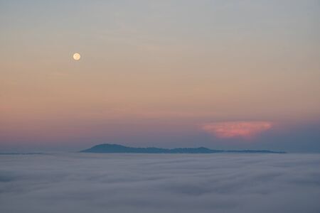 Full moon falling And the mist in the morning time. The color orange sky reflects the sun's rays.