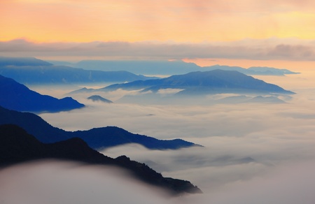 Sunrise over flowing fog between mountain peaks