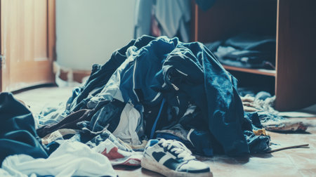 A large pile of assorted clothes lies on the floor in a cluttered room. Various garments are mixed together, while a pair of sneakers rests beside the clothes. Sunlight filters through an open door, enhancing the relaxed yet chaotic mood.