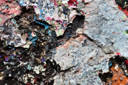 Detailed and colorful close up at cracked and peeling paint on concrete wall textures in high resolution