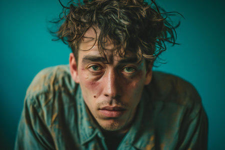 Studio dramatic portrait of a young bearded guy, thirty years old, with curly dirty greasy hair and a jacket. On a gray background.