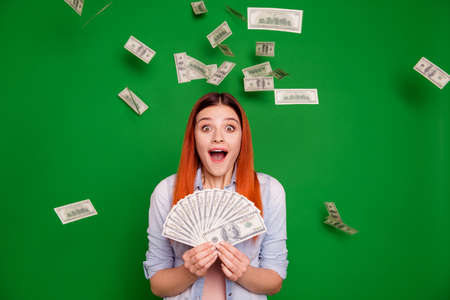 Portrait funny funky people content positive cheerful astonished incredible impressed wages bank notes fall scream shout win winner credit beautiful stylish isolated wear trendy jeans green background.