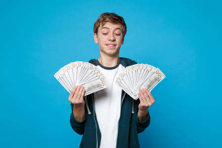 Smiling young man in casual clothes holding, looking on fan of money in dollar banknotes, cash money isolated on blue wall background. People sincere emotions, lifestyle concept. Mock up copy space