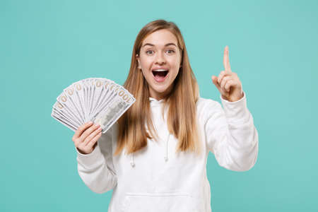Excited young woman girl in casual white hoodie isolated on blue turquoise background. People lifestyle concept. Hold fan of cash money in dollar banknotes, point index finger up with great new idea.