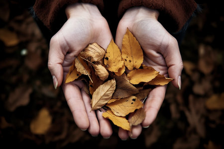 Woman hands holding dry leaves, top view, Generative AI