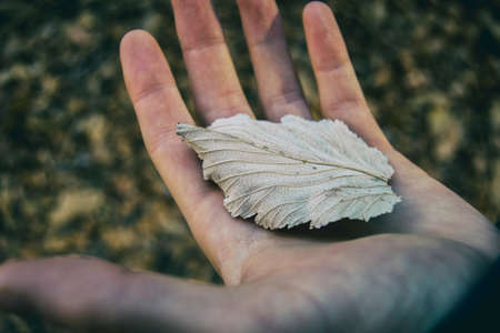 Closeup Photo of a Dry Tree Leaf in Hands. Change of Seasons Concept. Autumn has Come.