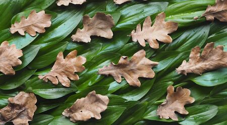Background from autumn dry leaves on top of succulent green. Comparison of life and death. Place for text.